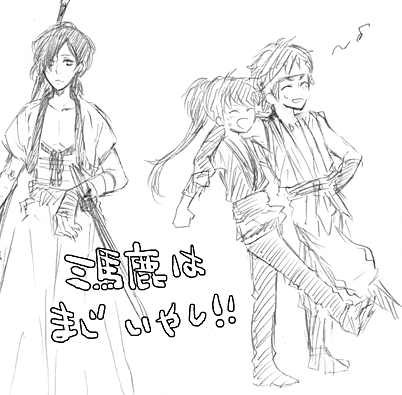 →「わり、オレ両手塞がってて持てねーわ」(片手に槍、もう片手に羽織)
